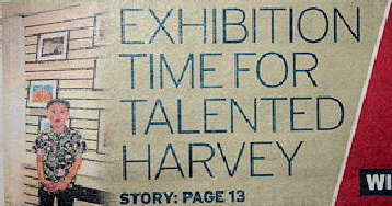 When Dad came home from work today he said, “Guess what Harvey, you are in the Herald” and he then showed me. There was a little picture of me on the cover with the words “Exhibition Time For Talented Harvey” and then inside on page 13 there was a nice article about my exhibition. Mum and Dad said the photo was funny as when Dad took it I kept pulling funny faces.